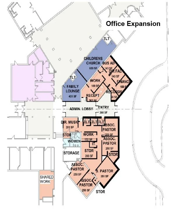 Offices would be consolidated to create a collaborative workflow out from the current office entrance to the church. The Children’s Church and Family Lounge would be brought over to the Atrium to create accessibility for families.